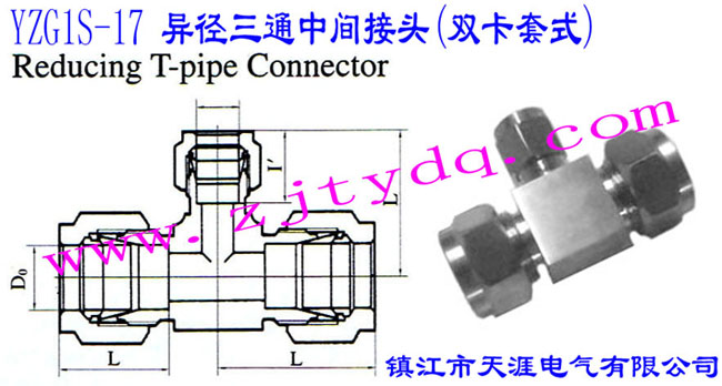 搜索關鍵詞:儀表管接頭 儀表閥門 雙卡套式管接頭 YZG1S-17 雙卡套式異徑三通中間接頭 YZG1S-17 Double sleeve reducing tee intermediate fittings 鎮江市天涯電氣有限公司